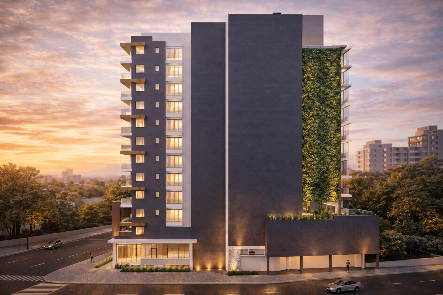 Renders cirúrgicos de fachadas e interiores com materiais e iluminação fisicamente corretos.